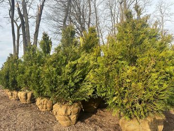 The Green Giant Arborvitae grows 30-40 feet tall with a spread of 12-18 feet. It thrives in full sun and well-drained soil. Water requirements are moderate, needing regular watering, especially in dry conditions. This tree has excellent deer resistance, making it ideal for landscapes with deer activity. It has a fast growth rate, adding 2-3 feet per year. With its dense, lush green foliage, it’s perfect for privacy screens, hedges, or as a windbreak.