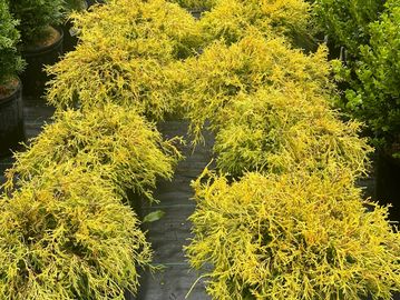 The Gold Thread Cypress grows 3-5 feet tall with a spread of 3-5 feet. It thrives in full sun to partial shade and well-drained, moist soil. Water requirements are moderate, with regular watering needed, especially in dry periods. This shrub has moderate deer resistance, though it may be browsed in extreme conditions. It has a moderate growth rate, adding 12-18 inches per year. Its vibrant golden-yellow foliage makes it a striking addition to gardens or landscapes.