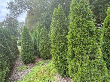 The Emerald Green Arborvitae grows 12-15 feet tall with a spread of 3-4 feet. It thrives in full sun to partial shade and well-drained, moist soil. Water requirements are moderate, needing regular watering, especially in dry conditions. This variety has poor deer resistance and should be avoided unless properly protected. It has a moderate growth rate, adding about 1 foot per year. With its dense, vibrant green foliage, it’s ideal for privacy screens, hedges, or small la